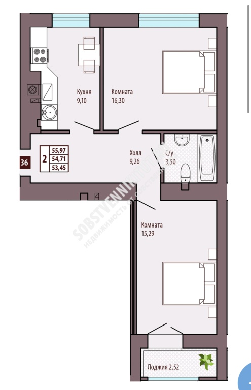 Площадь — 55/31/9 м2 общая/жилая/кухня