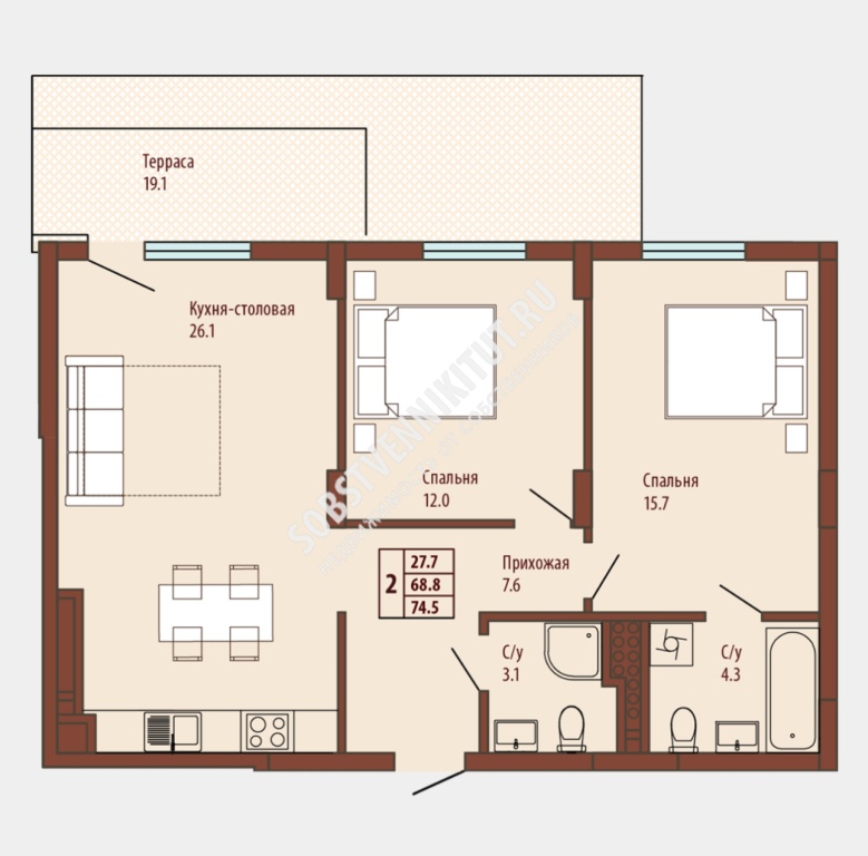Площадь — 72/28/24 м2 общая/жилая/кухня