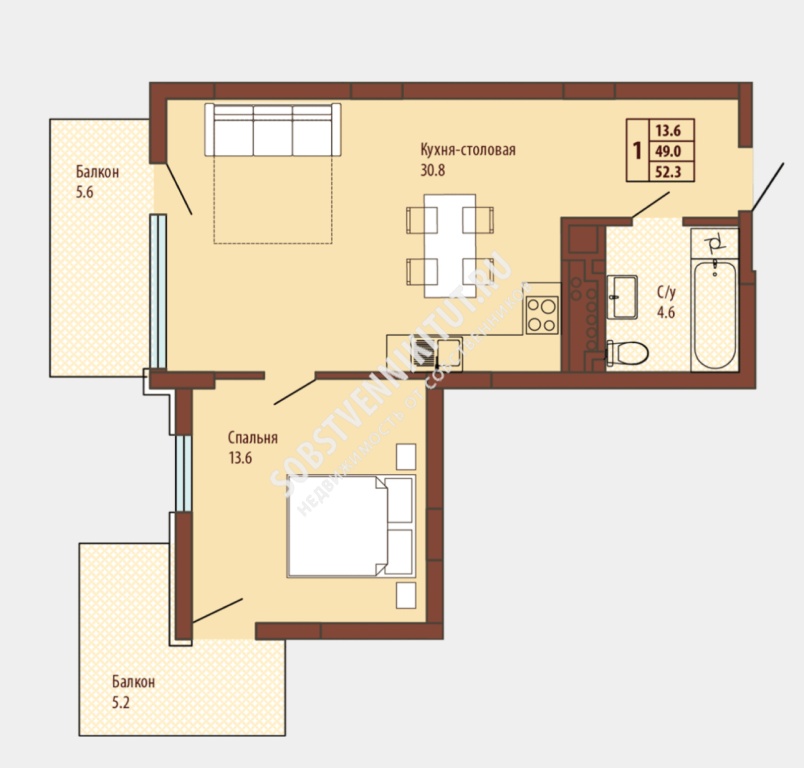 Площадь — 54/13.7/28 м2 общая/жилая/кухня
